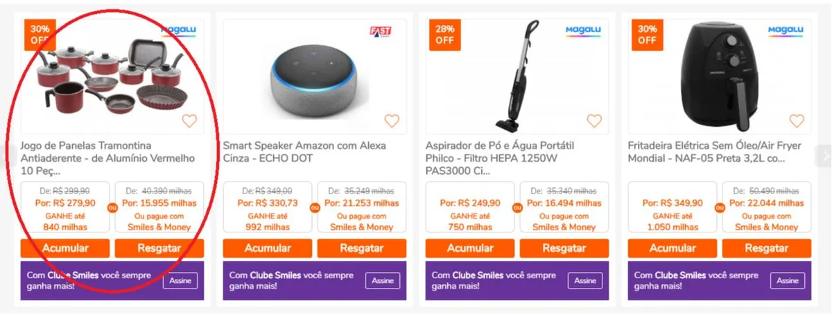O Shopping Smiles pode ser uma opção muito interessante se você quer adquirir algum produto de uma das lojas parceiras, pois além de gerar pontos, você também pode ter descontos, como no exemplo acima (o mesmo conjunto de panelas no site da Magalu está custando R$ 299,99). No entanto, para resgatar produtos o serviço não se mostra interessante, visto que é necessária uma quantidade elevada de milhas para realizar a troca.