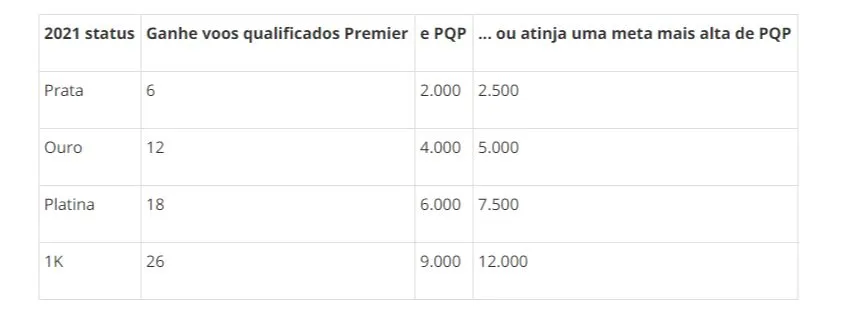 Os associados do MileagePlus, da United, também terão o status conquistado em 2020 válido até 31 de janeiro de 2022. O programa ainda reduziu as regras de qualificação, em 50% para cada categoria, para os clientes que desejarem alcançar um status mais alto para 2022. De toda forma, ainda é necessário voar no mínimo quatro segmentos na United ou United Express. Confira a tabela para 2021: